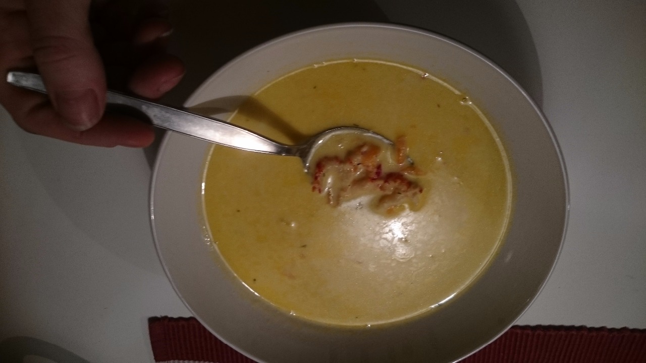 Lägg smöret i en kastrull o riv morötterna på den grova sidan, bryn dom lätt i kastrullen! Häll på vattnet o lägg i buljongen, ja tog mindre vatten typ 0,75 l vatten för ja avstår mjölet eftersom ja e glutenintollerant. Koka upp de som e i grytan, lägg i creme fraischen o kräftosten i grytan o rör te de smält o de e en slät kräm i grytan. Smaka av med salt o peppar. Lägg till sist i kräftstjärtarna, pressa ur så mkt vätska som möjligt innan du lägger i dom annars blir soppan blaskig.